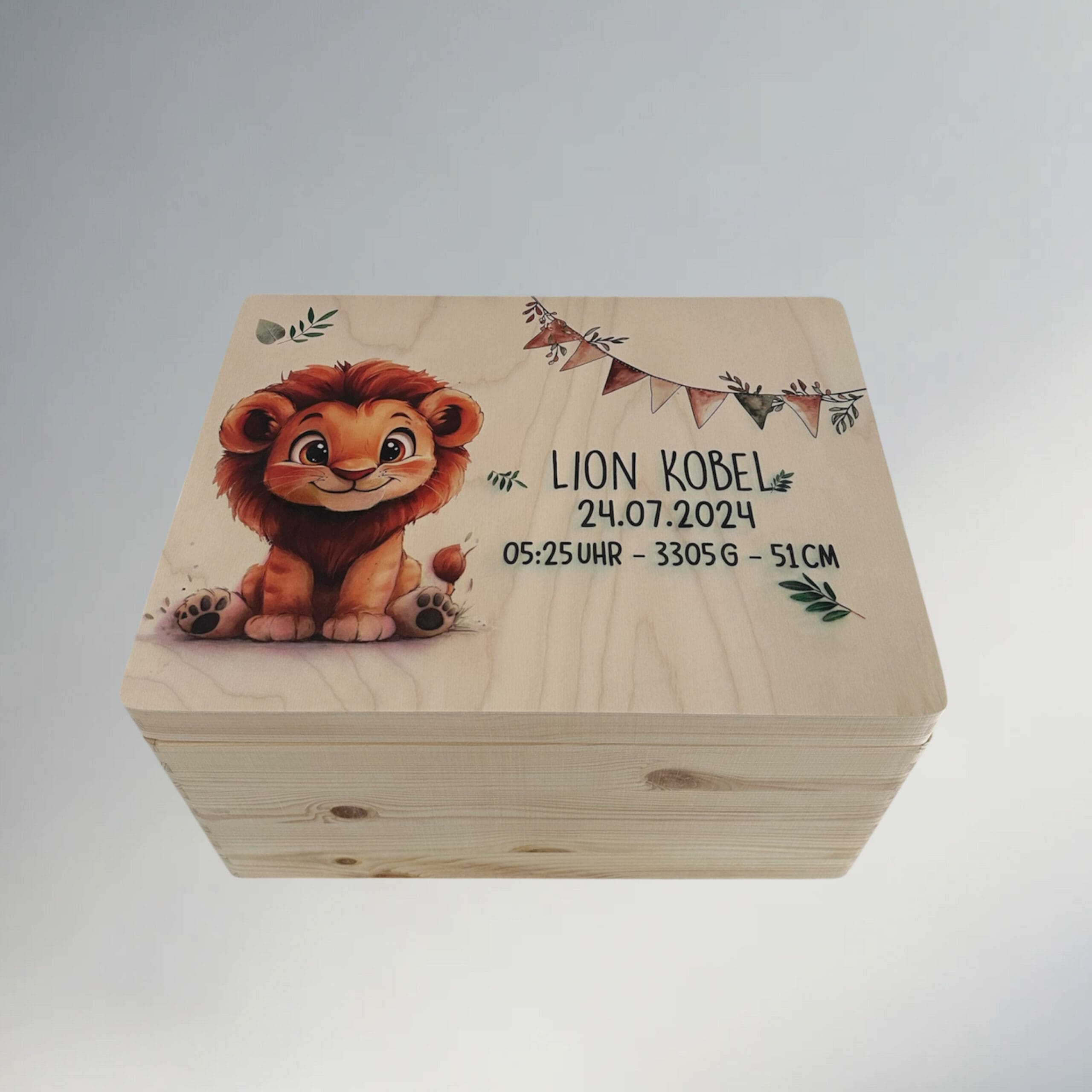 Dank des niedlichen Löwenmotivs in Aquarelloptik und der individuellen Gestaltung wird jede Erinnerungskiste zu einem echten Hingucker im Kinderzimmer. Die Personalisierung mit Name, Geburtsdatum, Uhrzeit, Gewicht und Grösse erfolgt per Direktdruckverfahren – langlebig und ganz ohne Aufkleber.