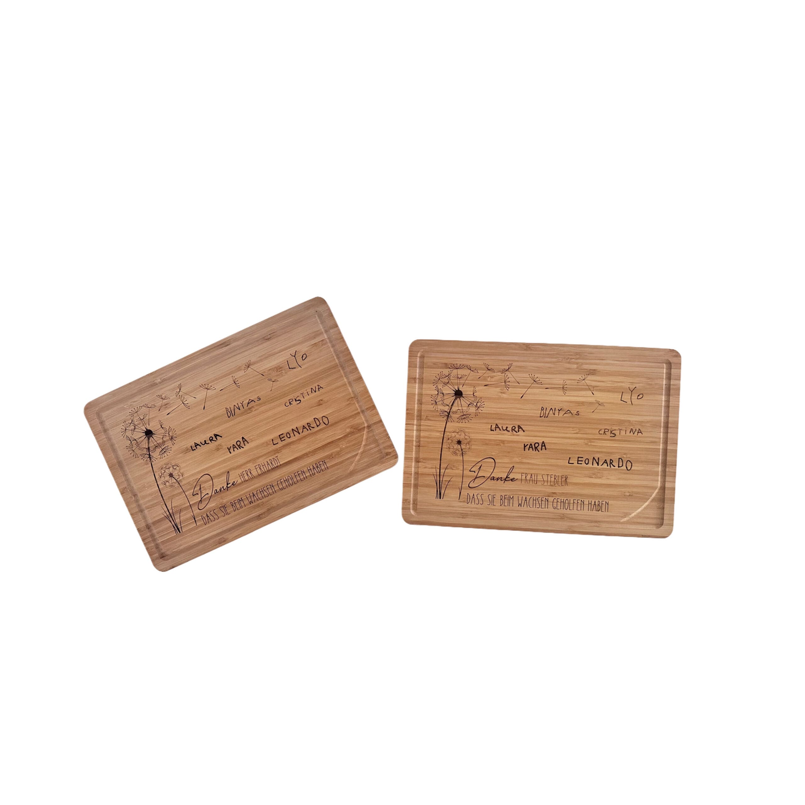 Das besondere Highlight: Du kannst das Schneidebrett mit deinem Wunschtext personalisieren lassen. Ob ein Dankeschön mit dem Namen der Erzieherin, eine liebevolle Botschaft von der ganzen Klasse oder einfach nur ein Vorname – du entscheidest, was auf dem Brett stehen soll. Das feine Pusteblumen-Design ergänzt die Gravur perfekt und verleiht dem Ganzen eine besonders liebevolle Note.