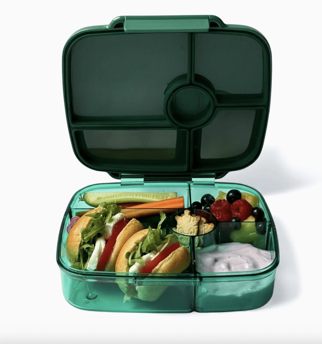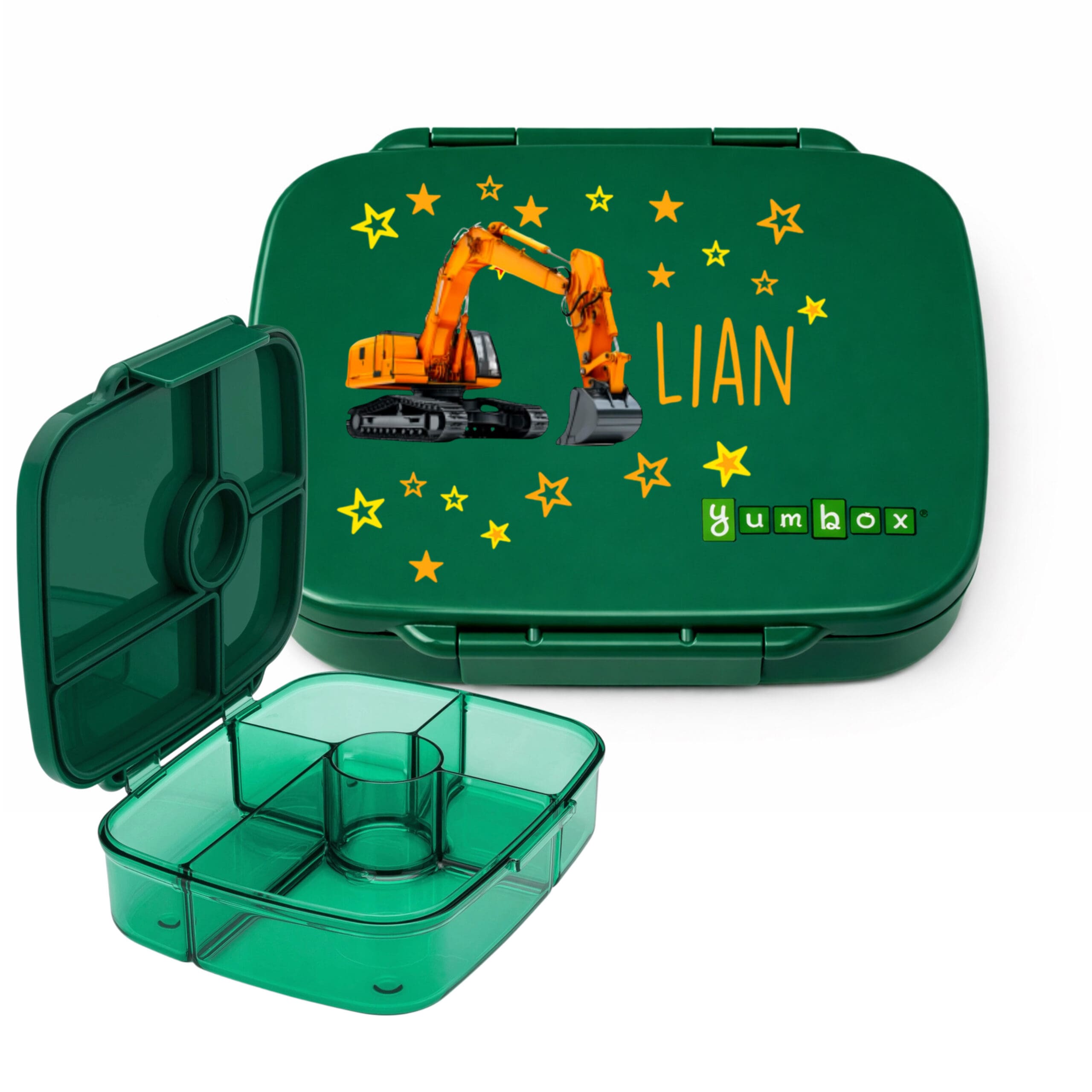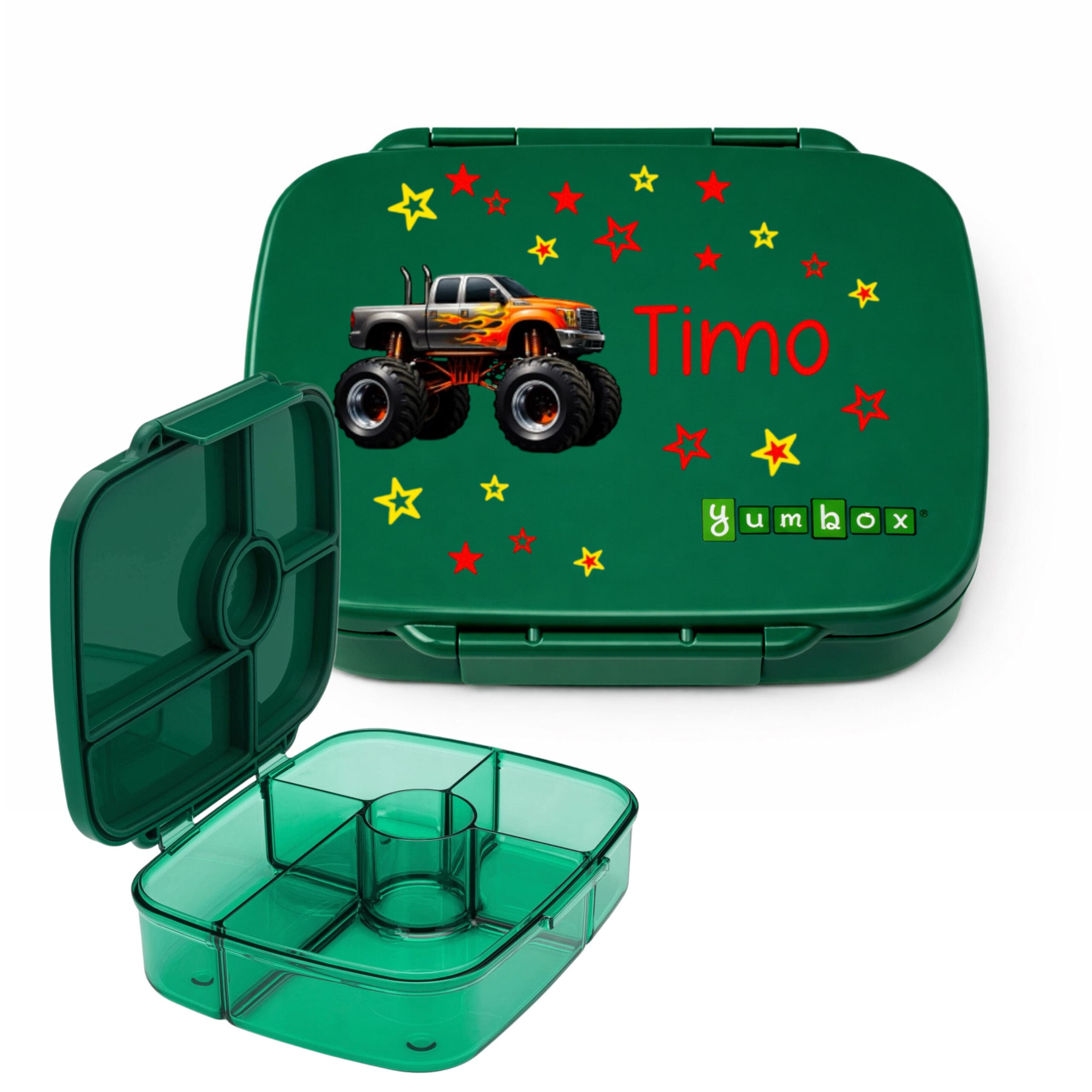 Die Znünibox Yumbox Go grün personalisiert mit Fächern überzeugt durch ihr auslaufsicheres Design. Egal ob im Rucksack, in der Schultasche oder im Arbeitsalltag – deine Lebensmittel bleiben sicher verstaut.