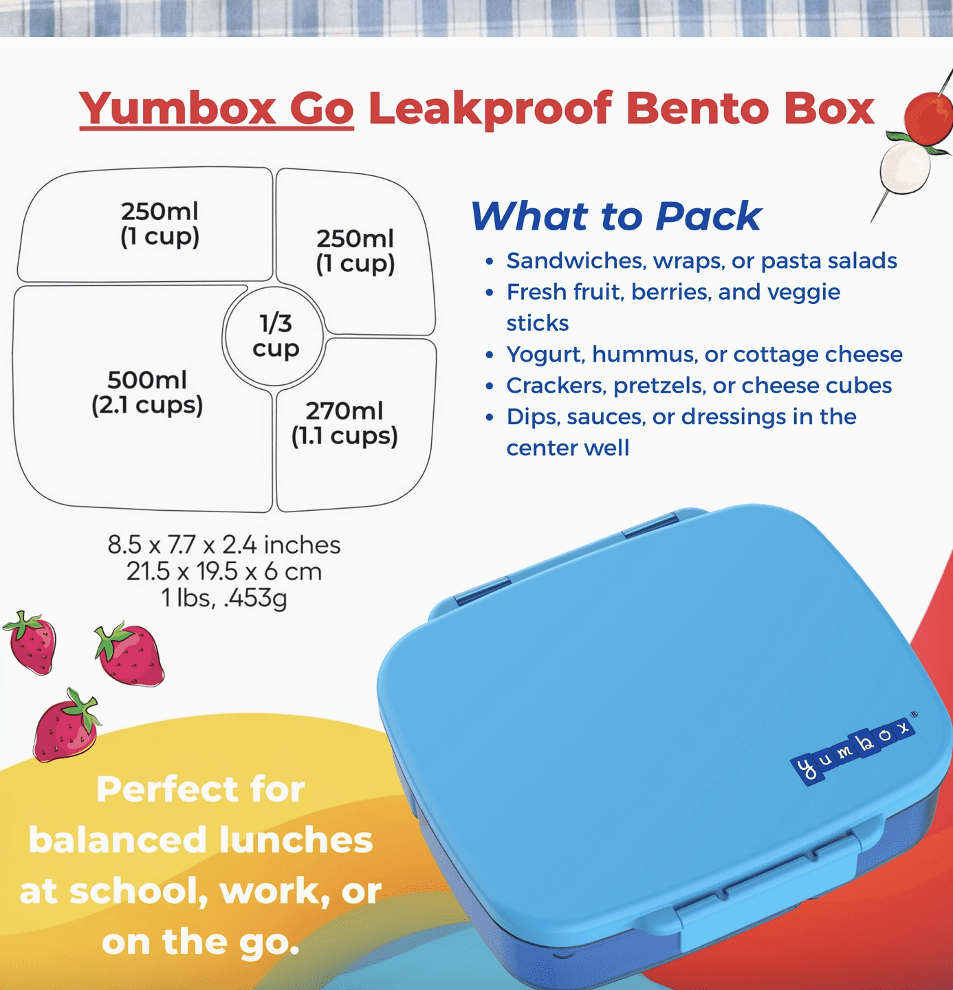 Im Vergleich zu kleineren Znüniboxen bietet die Yumbox Go mehr Platz für eine vollständige Mahlzeit. Dadurch eignet sie sich nicht nur für kleine Snacks, sondern auch für den ganzen Tag.